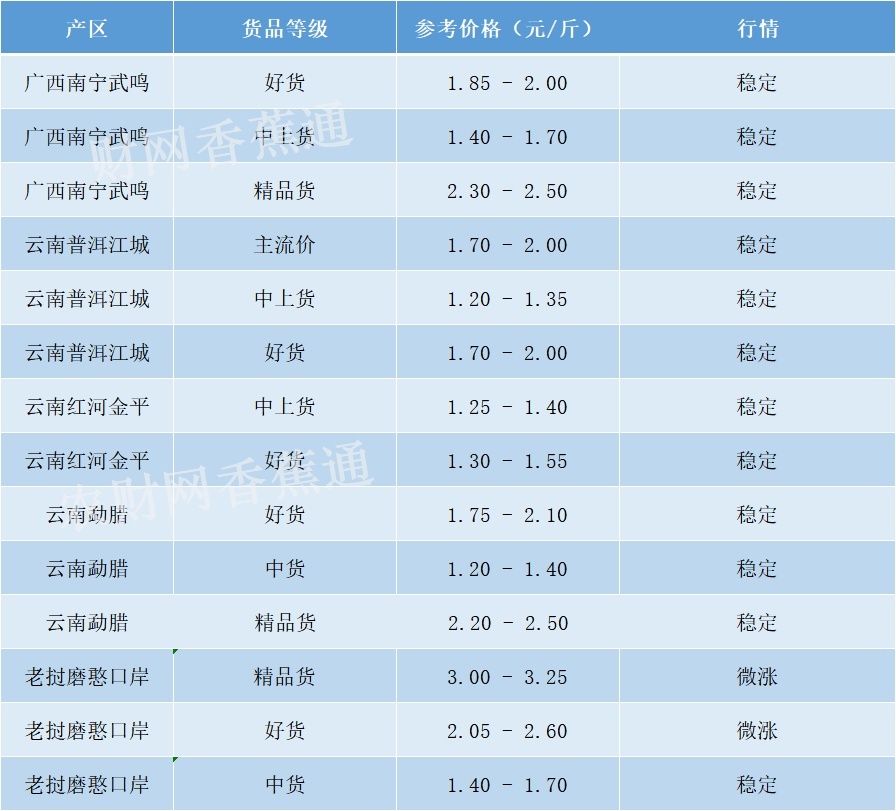 广西南宁武鸣市场香蕉余货较少,价格稳定,看货定价,好货1.85-2.00元/斤,中货1.40-1.70元/斤,个别精品索道蕉2.30-2.50元/斤,看货定价。